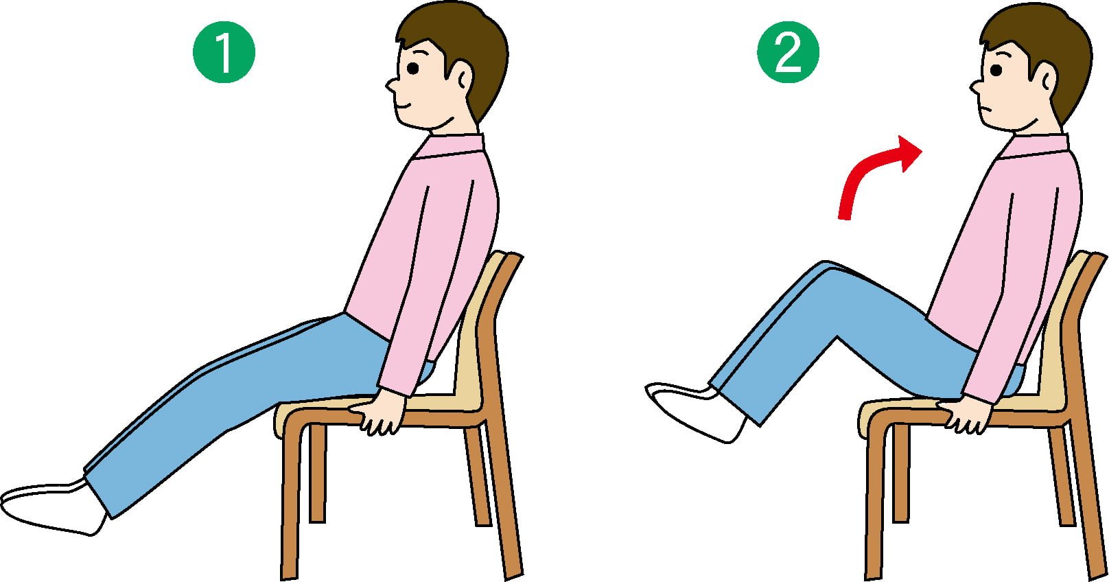 ①イスにもたれて両脚を伸ばして座り、イスをつかむ