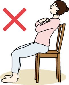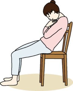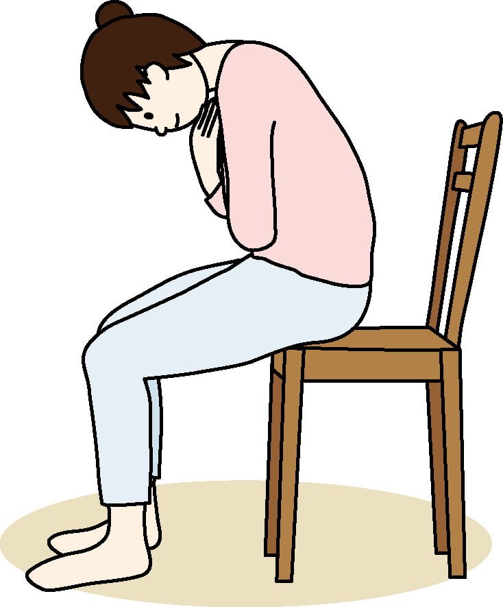 ①腰幅に足を開いていすに浅く座り、あごを引いて背中を丸める。手は胸かお腹にあてる。