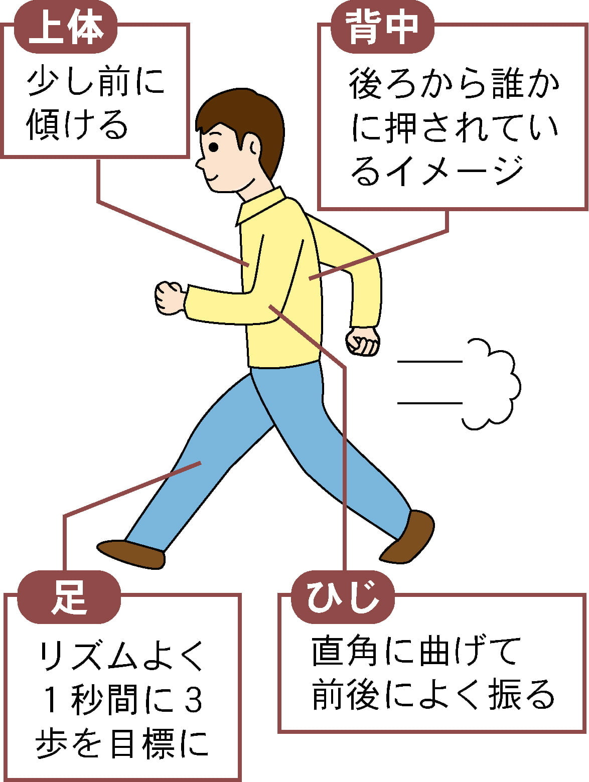 ※どちらも上半身は頭とあごを引き、腕は後ろにしっかり振りながら、胸の中央を前に出すように意識する。