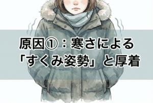 寒いと、首をすくめて肩をキュッと上げてしまいませんか? この「すくみ姿勢」が続くと、首から肩にかけての僧帽筋(そうぼうきん)が常に緊張状態になり、血流がストップしてしまいます。