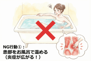 入浴は最高の治療タイムです。浮力があり体重負担がかからないお湯の中で、ゆっくりと膝の曲げ伸ばしを行ってください。 関節液の巡りが良くなり、スムーズに動くようになります。
