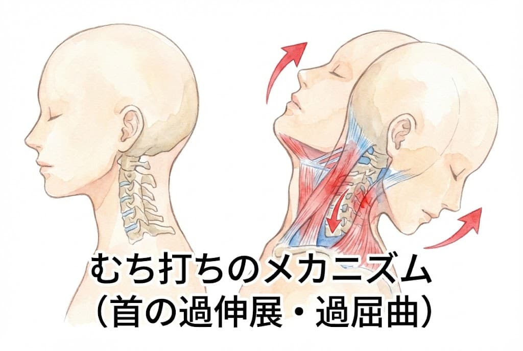 交通事故で最も多い怪我が、首の捻挫である**「むち打ち症(頚椎捻挫)」**です。 しかし、事故に遭った直後は、極度の興奮状態(アドレナリン分泌)にあるため、痛みを感じないことがよくあります。