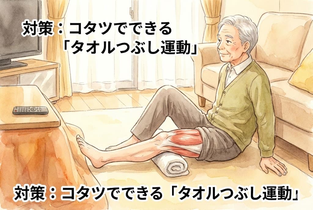 「痛いから動かさない」のが一番良くありません。 膝に体重をかけずに、筋肉だけを鍛える**「タオルつぶし運動(パテラセッティング)」**がおすすめです。