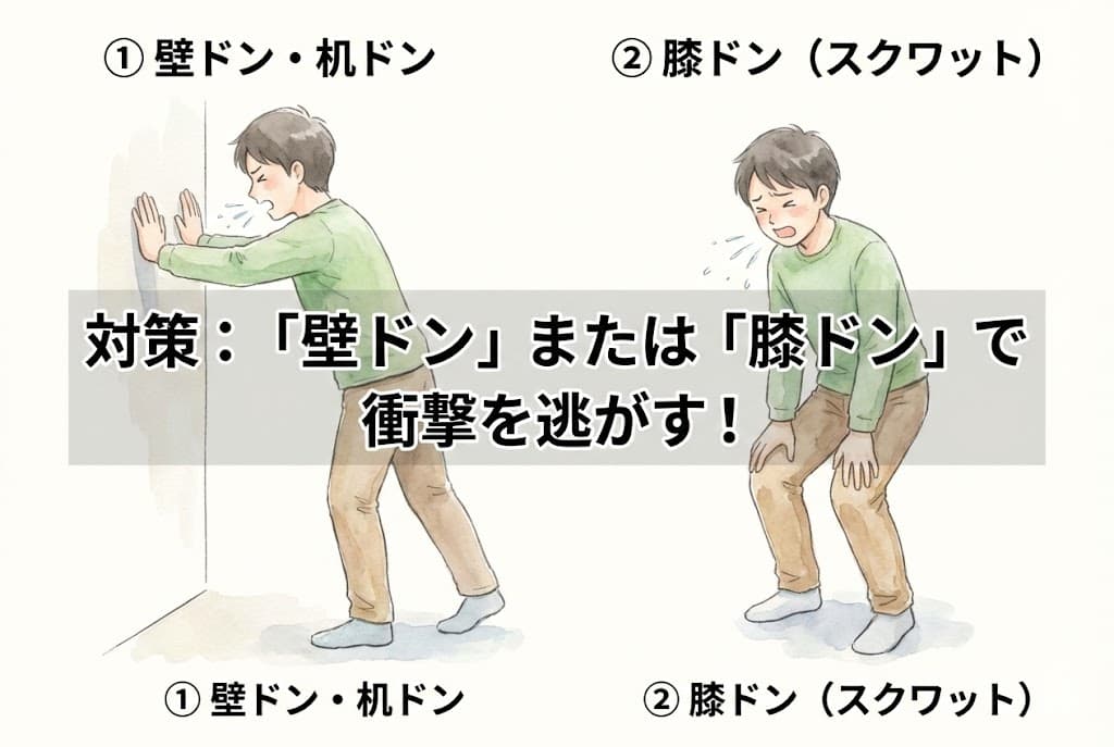 くしゃみは生理現象なので、我慢することはできません。 大切なのは、**「くしゃみが出そうになった瞬間に、腰へ衝撃を逃がす体勢をとること」**です。