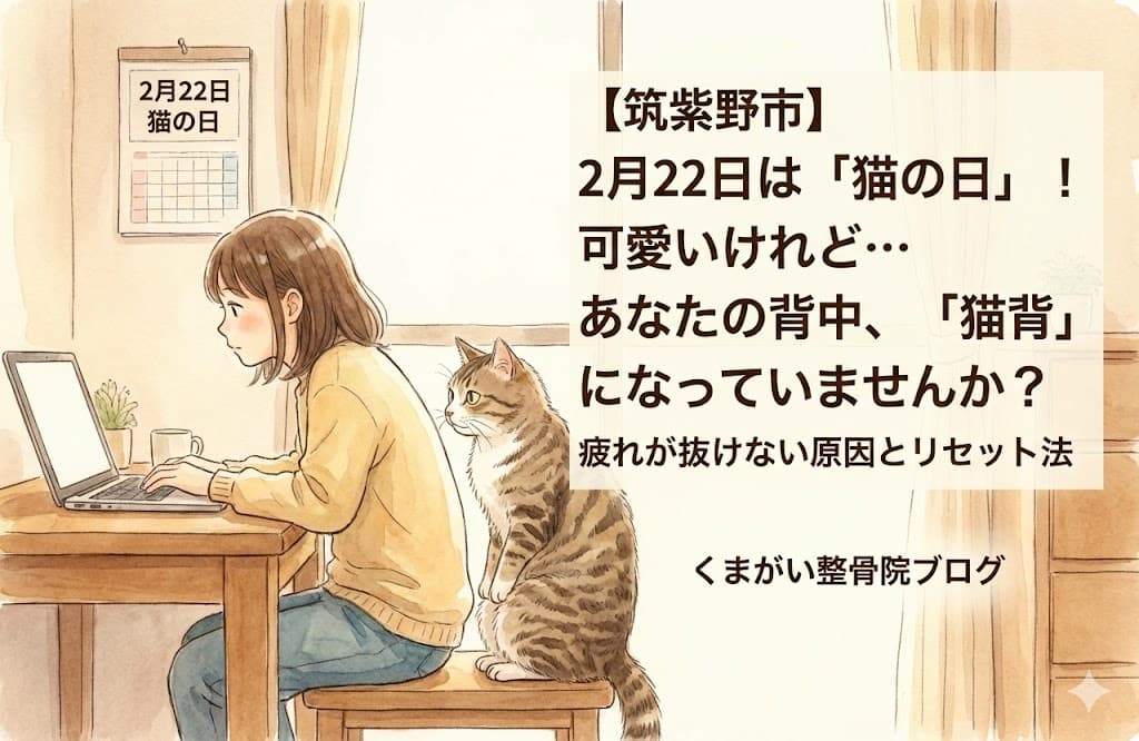 こんにちは!筑紫野市杉塚の「くまがい整骨院」です。 本日2月22日(日)は、語呂合わせで**「猫の日(ニャン・ニャン・ニャン)」**ですね🐈