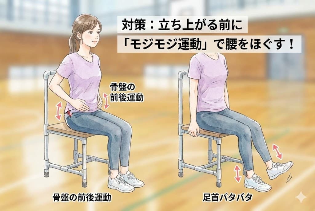 【2. 立ち上がる前の「モジモジ運動」】 式典が終わり、立ち上がる前に「たった10秒」これをやるだけで、ぎっくり腰の確率をグッと下げられます。