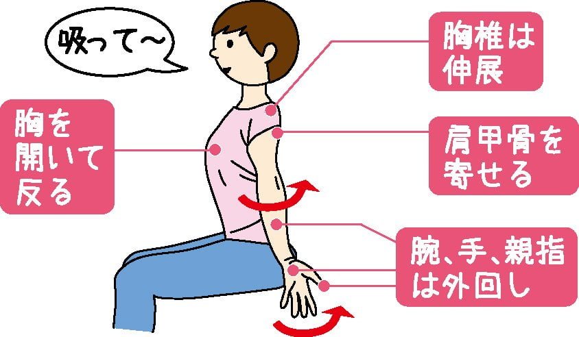 1.両手を体の脇に下げて、息を吸いながら左右の肩甲骨を寄せる。手のひらを親指側から外に回し、肘の内側が外を向くようにひねる。