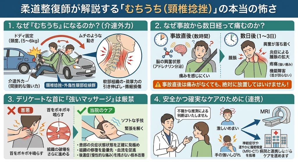 交通事故直後は痛みがなくても、数日後に突然「むちうち」の辛い症状が出ることがあります。